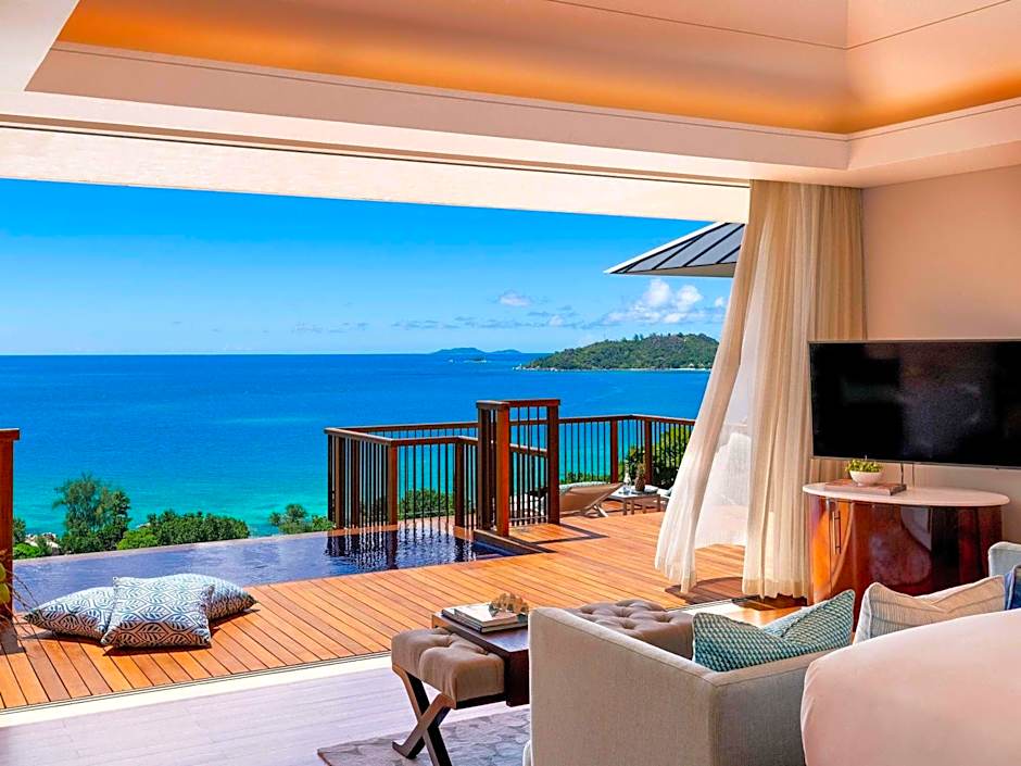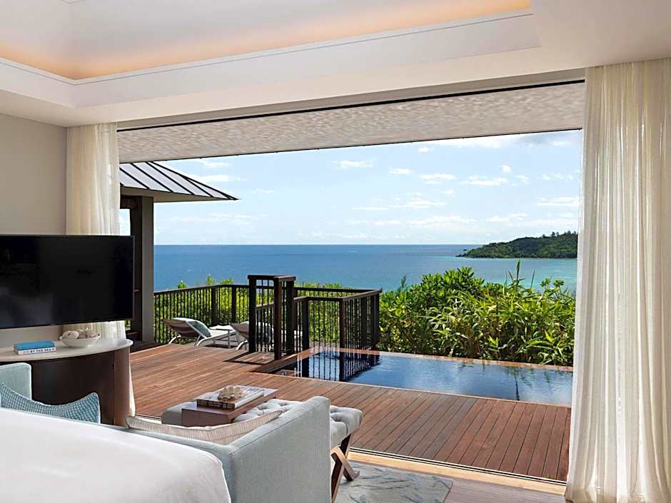Offering panoramic ocean views, this villa features a separate bedroom with an private bathroom. It also offers living area and an outdoor pavilion with an open-air balcony, a dining area, a private pool. This inlcudes the services of a private butler.
