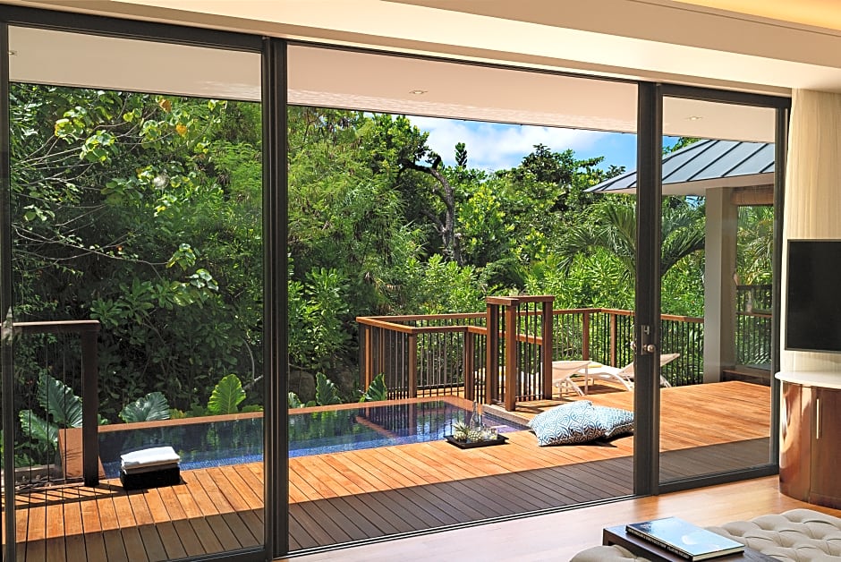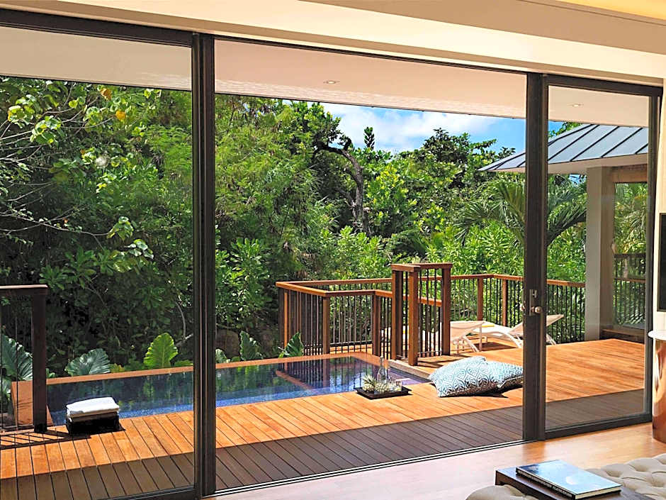 Each villa features a spacious bedroom and bathroom. It features a spacious terrace with a private pool, as well as indoor and outdoor rain showers. Other features include a soaking tub with an ocean view.